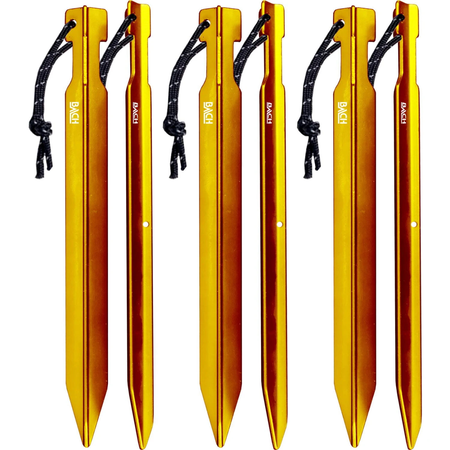 Die Irregular Y24 Pegs von BACH sind ultraleichte, geschwungene Heringe aus Aluminium. Diese Aluminumheringe in 24 cm Länge können in nahezu allen Bodenarten verwendet werden, eignen sich aber besonders für feste Böden aber auch auf Grund ihrer Größe für lose Untergründe. Die Y-Form sorgt für ein gutes Eindringen in den Boden und bietet einen effektiven Halt. Eloxierte Aluheringe in goldgelb mit Kordel zum rausiehen eigenen sich für Zelte, Tarps und andere leichte Dinge, bei denen es auch auf das Geiwcht ankommt.